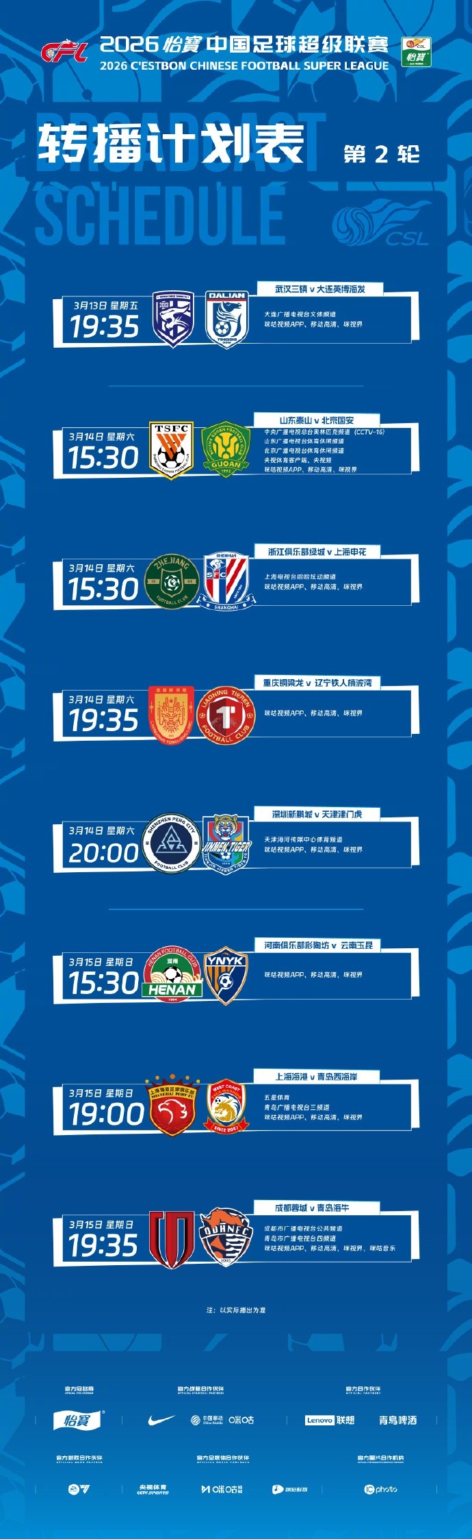 3月12日讯 新赛季中超联赛第二轮将于3月13日-15日进行,中超官方公布本轮转播计划,CCTV16、山东体育、北京体育转播京鲁大战。