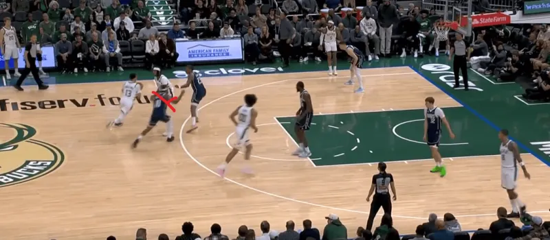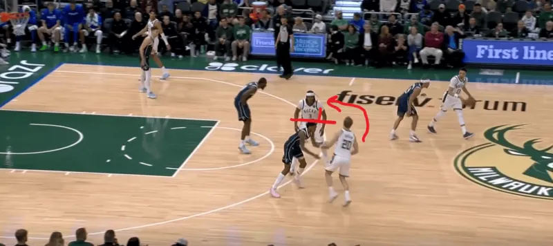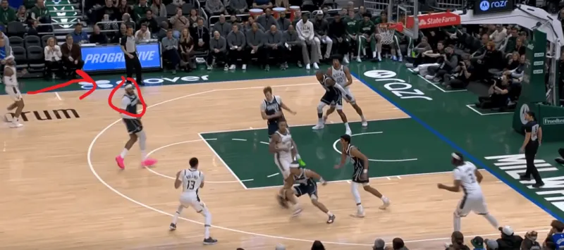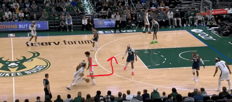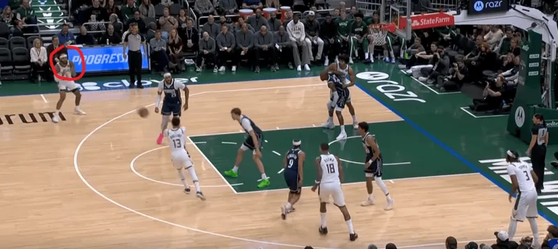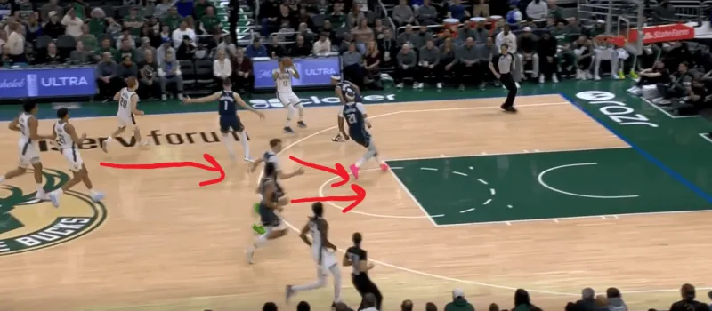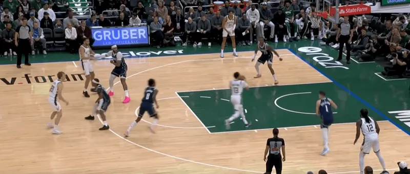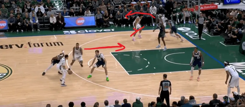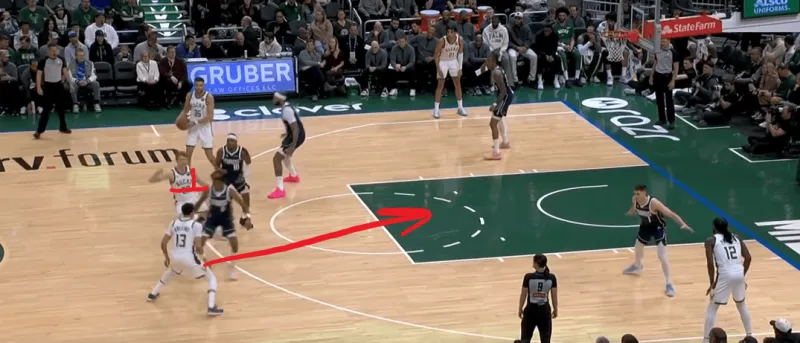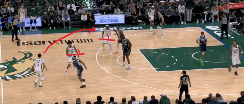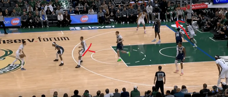 这一次的弧顶drag掩护发起,雄鹿在有球端和无球端的挡拆同时启动,目的是让库兹马顺下接球有更好的攻筐空间,左侧特伦特借西姆斯的exit掩护兜出,库兹马顺下接罗林斯口袋传球切入快速得分: